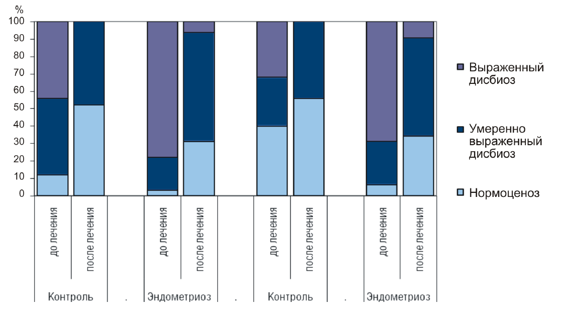 Results. The obtained data demonstrated an altered microflora of the urogenital tract and gut in patients with stage III and IV endometriosis. After therapy, the groups ceased to differ in the frequency of detection of normocenosis, moderate dysbiosis and severe dysbiosis that testifies to the normalization of urogenital tract and intestinal microflora in patients with moderate and severe courses of ovarian endometriosis. Further research is needed to examine whether dysbiosis is a consequence of the development of moderate and severe endometriosis or dysbiosis is a concomitant background pathology that contributes to the formation of endometriosis of this degree of severity.