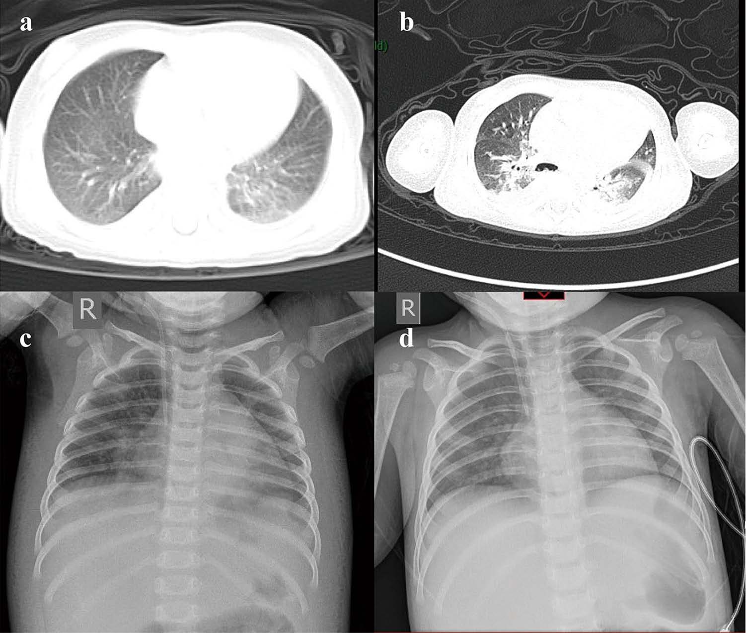 Рис. Больной 10-месячный мальчик с инфекцией COVID19 и двусторонней пневмонией, контактировавший с заболевшей матерью. Клинические проявления: одышка, кашель, большое количество мокроты, рвота. В легких при аускультации определялась крепитация. Находился на ИВЛ в течение 7 дней. Рентгенография грудной клетки и КТ грудной клетки: а – небольшие плотные тени и выпот в плевральной полости (4 февраля 2020 г.); b – симптом «матового стекла» и очаги инфильтрации (9 февраля); с – развитие поражения (12 февраля); d – рентгенография грудной клетки с улучшением (в динамике) [26]