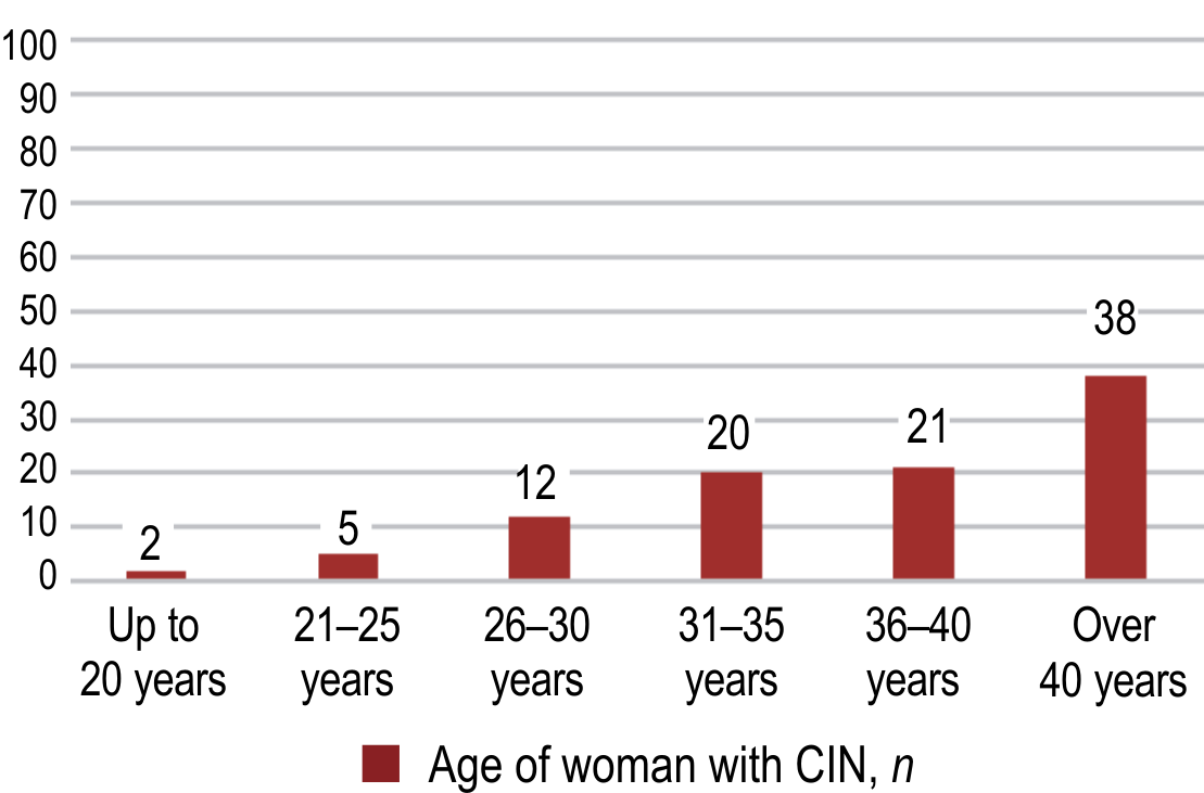In the ECPC cervical pathology office for the period from January to September 2022, a total of 255 cases of precancerous cervical diseases and 7 cases of cervical cancer were revealed. Among them, 24 patients with newly diagnosed precancerous pathology and 4 with CC had previously been followed up by a specialist. Primary cervical pathology most often occurred in patients over 40 years old – 93 cases (38 %), least often – in patients under 20 years old – 5 cases (2 %). There were no statistically significant differences in the incidence of CIN in women under 40 years old (p > 0.05). But after 40 years, the prevalence of precancerous diseases is significantly higher than in patients under 20 years of age (p = 0.017), from 21 to 25 years (p = 0.0017) and from 26 to 30 years (p = 0.017). The age distribution of patients with precancerous cervical diseases is presented in Fig. 1.