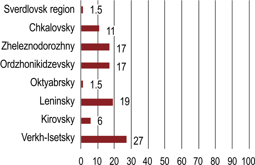 Fig. 2. Distribution of cervical pathologies cases detected for the first time by district of Yekaterinburg for the period from January to September 2022, %