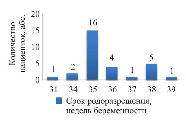 Чаще планировали родоразрешение в сроке 35–36 недель. 20 (64,5 %) пациенток были прооперированы именно в эти сроки, 7 (22,58 %) – при доношенном сроке беременности, из которых у 5 (16,13 %) врастание выявлено в операционной, а у 2 (6,45 %) – при поступлении в стационар на плановое родоразрешение (рис. 1).