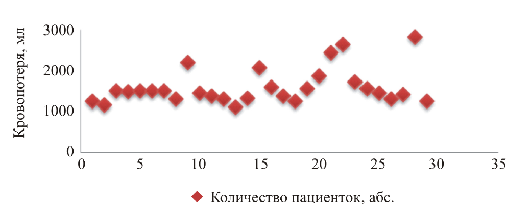 Общий объем кровопотери составил 1625 ± 485 мл, а медиана 1455 мл. Кровопотеря более 2000 мл была только у 5 (17,24 %) пациенток, кровопотери более 3000 мл не было. У всех женщин объем кровопотери определялся гравиметрическим методом, когда оценка кровопотери осуществлялась с помощью взвешивания стерильного материала (салфеток, тампонов, пеленок), и определением объема возврата эритроцитов при аппаратной реинфузии крови (рис. 2).