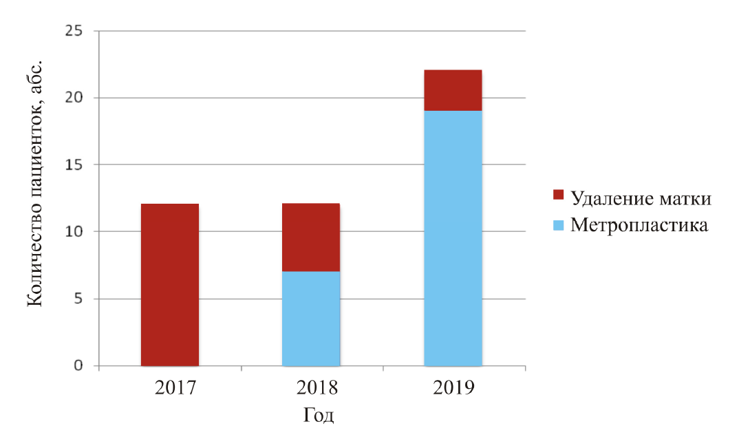 Results. Out of 31 patients we observed, 27 underwent metroplasty using complex compression hemostasis, and 1 patient underwent temporary balloon occlusion of the internal iliac arteries. The total volume of blood loss was 1625 ± 485 ml, and the median was 1455 ml. Only 5 (17.24 %) patients had a blood loss of more than 2000 ml, and there was no blood loss of more than 3000 ml.