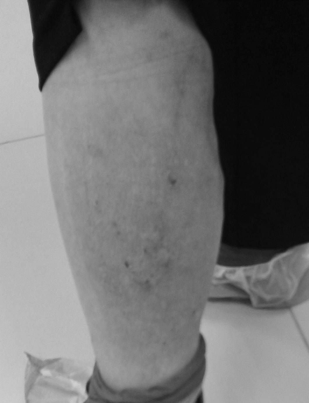 Status localis: кожный патологический процесс распространенный, симметричный, располагается на наружной поверхности бедер и голеней, представлен полиморфными высыпаниями в виде узлов полушаровидной формы, плотной консистенции, буровато-коричневого цвета, диаметром 1,5–2,0 см, некоторые из узлов сливаются между собой с формированием бугристых бляшек 3,0–3,5 см в ширину и 4,5–5,0 см в длину, с четкими границами, неправильной формы; на поверхности узлов и бляшек экскориации, серозно-геморрагические корки и мелкопластинчатое шелушение, грубые чешуйки сероватого цвета (рис. 1).