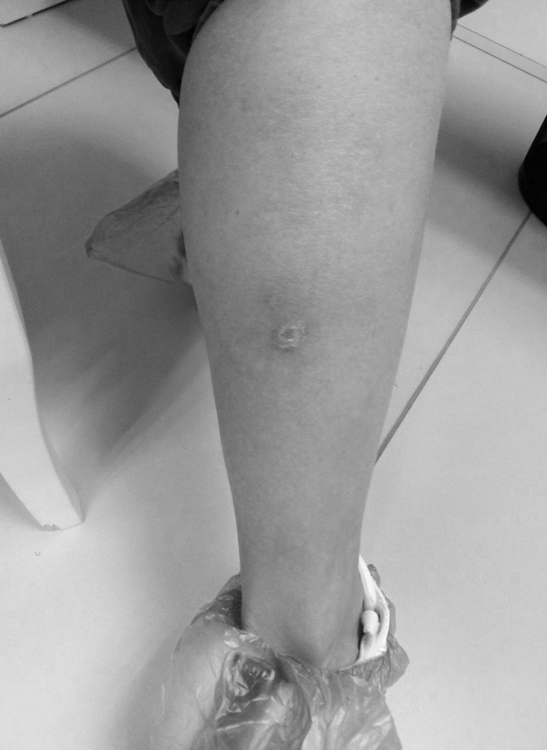 Status localis: кожный патологический процесс распространенный, симметричный, располагается на задней поверхности голеней, представлен высыпаниями в виде единичных узлов полушаровидной формы диаметром 1,0–1,5 см, с четкими границами, без слияния друг с другом, плотноватой консистенции, красновато-коричневого цвета, на поверхности узлов множественные экскориации, корочки серозно-геморрагического характера и умеренное мелкопластинчатое шелушение плотными светло-коричневого цвета чешуйками (рис. 2).