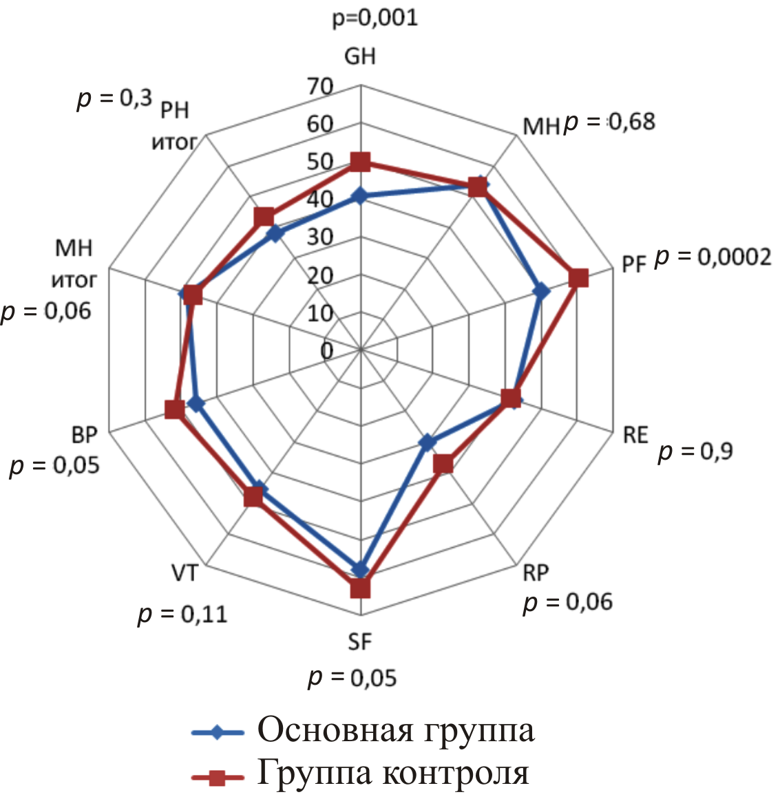 По результатам исследования (опросник SF-36) получена субъективная оценка больного удовлетворенности своим физическим и психическим состоянием. Показатели в обеих группах не достигали оптимального значения ни по одной шкале. Основная группа отличалась от группы контроля более низкими показателями шкал КЖ: физическое функционирование (PF), общее состояние здоровья (GH), интенсивность болей (BP), суммарный физический компонент (РН) (рисунок).