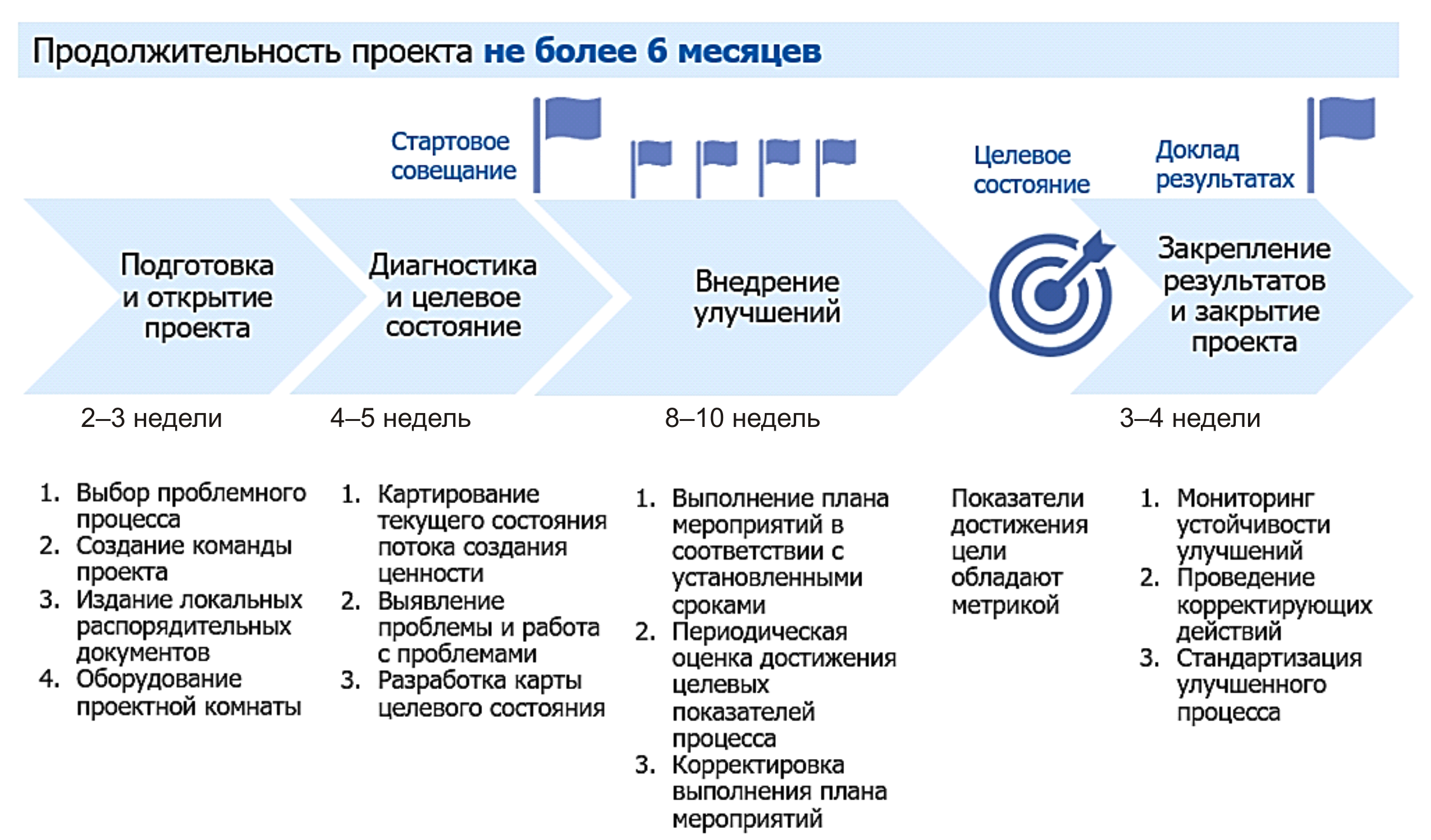 Проект по улучшению реализуется в рамках определенной методологии и ограничивается жесткими временными рамками (рисунок).