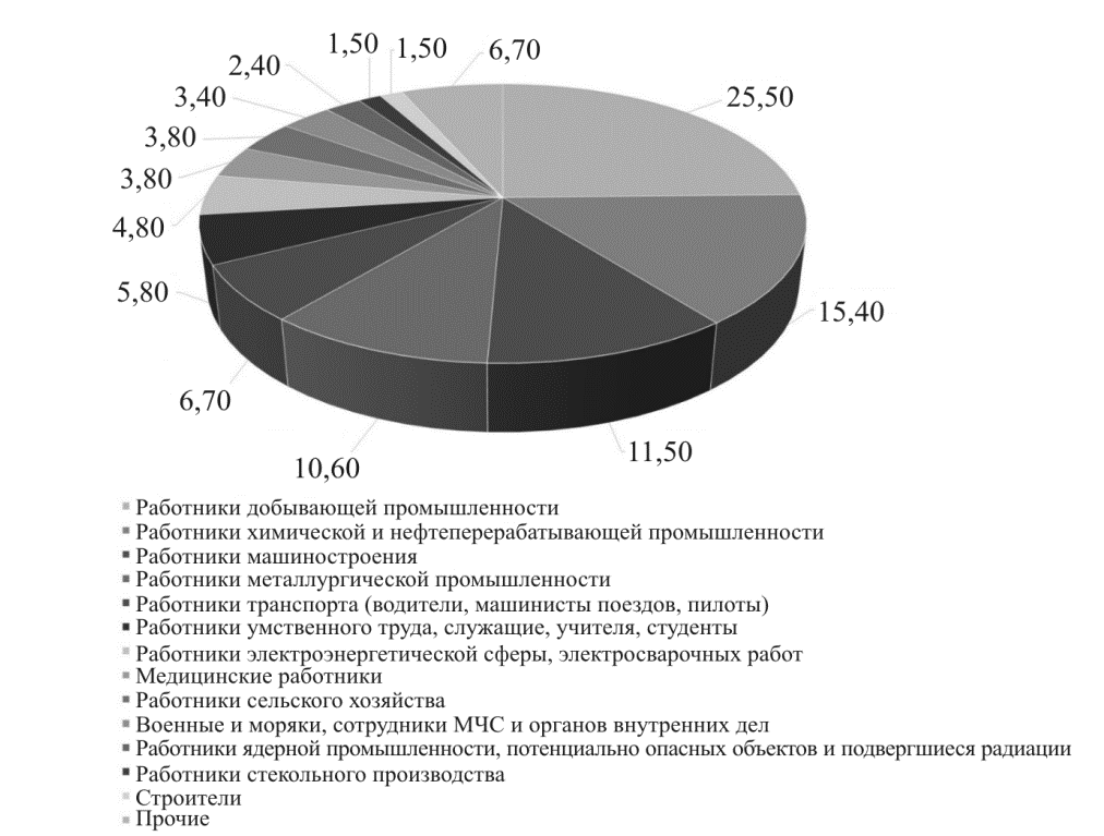 Исследованиям в проблеме сохранения профессионального здоровья военных, моряков, сотрудников органов внутренних дел и МЧС посвящены 3,4 % диссертаций, работникам ядерной промышленности и потенциально опасных объектов, а также подвергшимся радиации – 2,4 %, строителям и работающим в стекольном производстве – по 1,5 % в каждой группе.