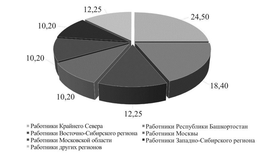 Из диссертационных работ, разносторонне разрабатывающих проблему сохранения профессионального здоровья и безопасности определенных регионов Российской Федерации, наибольшее количество посвящено аспектам профилактики и течения профессиональных и производственно обусловленных заболеваний работников Крайнего Севера – 24,5 %, трудоспособного населения Республики Башкортостан – 18,4 %, тружеников областей Восточной Сибири –