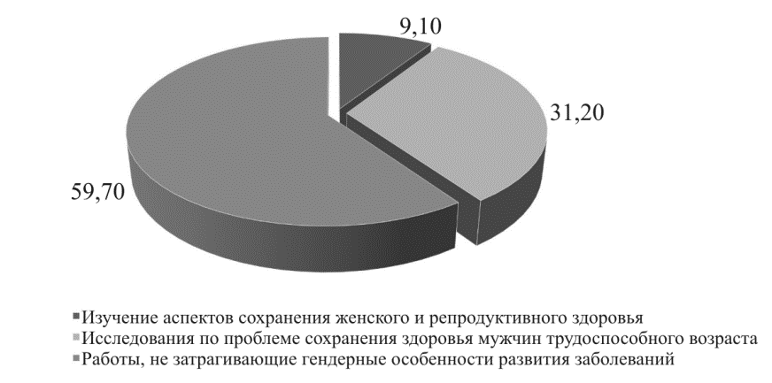 Особенностям возникновения и развития профессиональных заболеваний у мужского населения посвящены 96 единиц исследования, или 31,2 %. Это прежде всего связано с тем, что мужчины гораздо больше задействованы в работе с вредными и опасными условиями труда. Также мужской рабочий труд больше используется в добывающей и металлургической промышленности, нефтепереработке и машиностроении – основных зонах научных отраслевых исследований в медицине труда. Разработкой научно-практических закономерностей женского труда и проблемам именно женского репродуктивного здоровья посвящено всего 28 диссертационных работ, что составляет 9,1 % от общего числа (рис. 3).