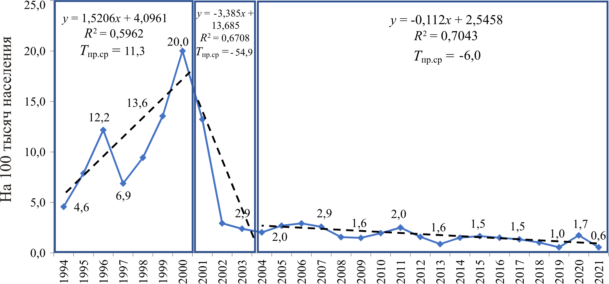 При анализе динамических изменений заболеваемости ОГС с момента регистрации выявлены значительные колебания показателя от 19,9 на 100 тыс. населения в 2000 г. до 0,6 на 100 тыс. населения в 2021 г. при среднем многолетнем уровне 4,4 на 100 тыс. населения. В динамике заболеваемости ОГС выделены три периода с разной интенсивностью ЭП (рис. 1). В период 2016–2021 гг. среднемноголетний показатель инцидентности ОГС составил 1,1 на 100 тыс. населения, что соответствует аналогичному показателю по РФ (1,0 на 100 тыс. населения).