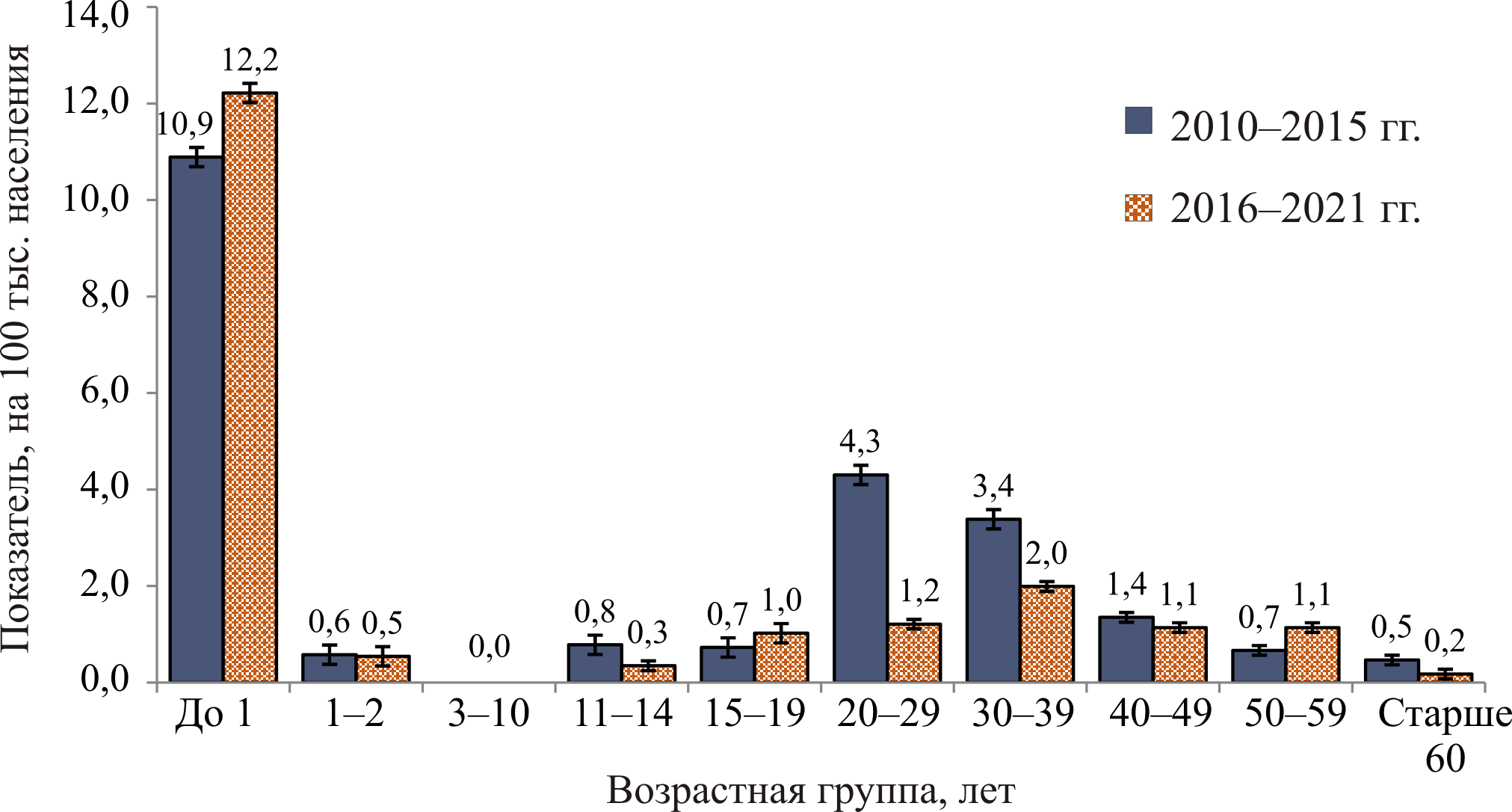 Заболеваемость ОГС детей и подростков с 2016 по 2021 г. была ниже показателей заболеваемости взрослых, их долевое участие в возрастной структуре составило 18,9 %. Подавляющее большинство случаев приходилось на детей до года (71,4 %). Обращает на себя внимание рост заболеваемости среди новорожденных в 2016–2021 гг. За исследуемый период случаи заболевания ОГС среди детей в возрасте от 3 до 10 лет не зарегистрированы. Единичные случаи зафиксированы среди детей в возрасте 1–2 года; 10–14 лет и подростков 15–18 лет, на их долю в возрастной структуре заболеваемости ОГС суммарно приходилось 28,6 %.