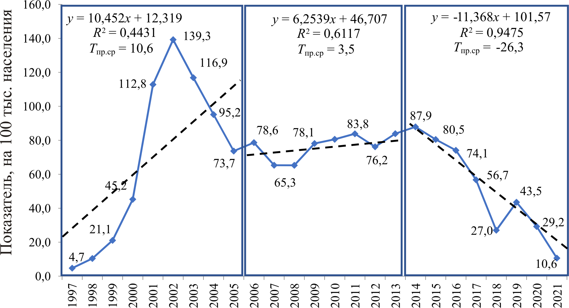 Рис. 3. Динамика заболеваемости хроническим гепатитом С в Нижнем Новгороде в 1997–2021 гг., 0/0000