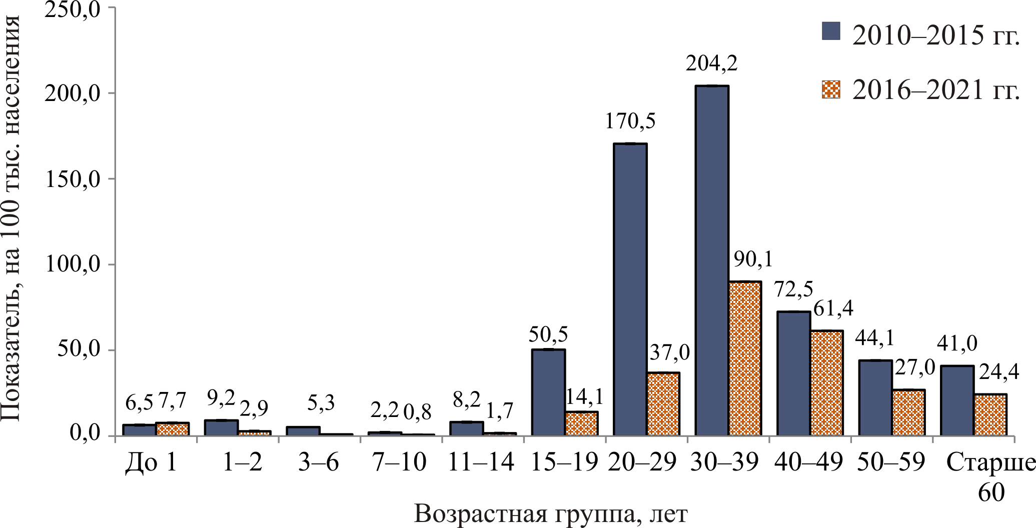 В 2016–2021 г. (Тпр.ср. = –27,3 %) уровень заболеваемости снизился в 7,7 раза (с 74,1 0/0000 в 2016 г. до 9,6 0/0000 в 2021 г.), среднемноголетний показатель составил 40,2 на 100 тыс. населения.