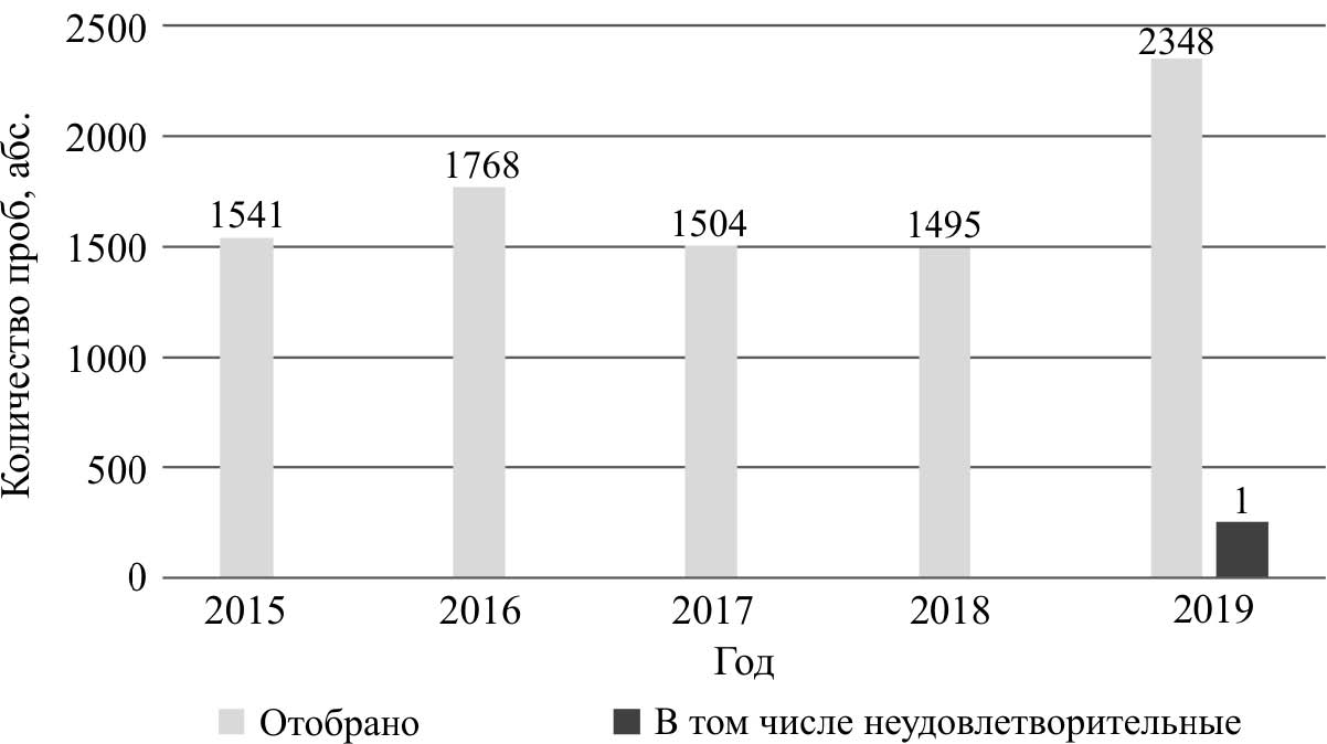 За период с 2015 по 2019 г. лабораторными подразделениями ФБУЗ «Центр гигиены и эпидемиологии в Астраханской области» (далее ФБУЗ), отобрано и исследовано 15 253 пробы с различных объектов окружающей среды, выполнено 21 850 исследований. Число проб, не отвечающих гигиеническим нормативам, составило 2,5 % (383 пробы) (табл. 1).