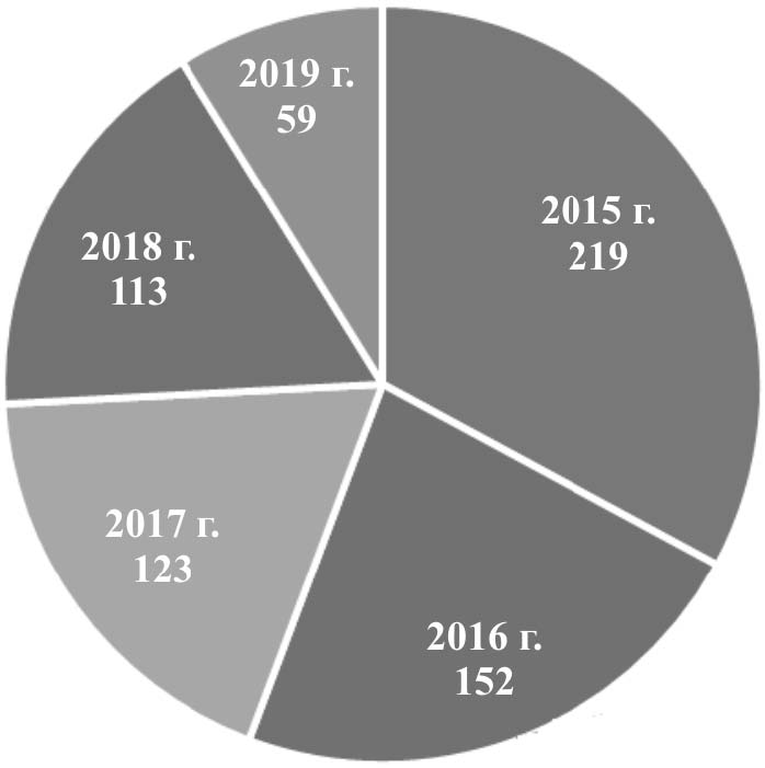 Рис. 2. Число исследованных проб воды, отобранной из источников централизованного водоснабжения в 2015–2019 гг.