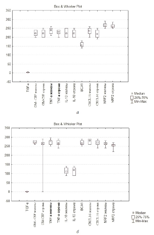 ИГХ-методом оценивали экспрессию цитокинов, факторов роста: в железистом эпителии и стромальных клетках (TNF-α,
