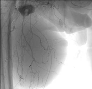 Рис. 1. Артериографическая картина гигантской аневризмы проксимального анастомоза АВБПШ: 1 – просвет аневризмы; 2 – тромбированная полость аневризмы