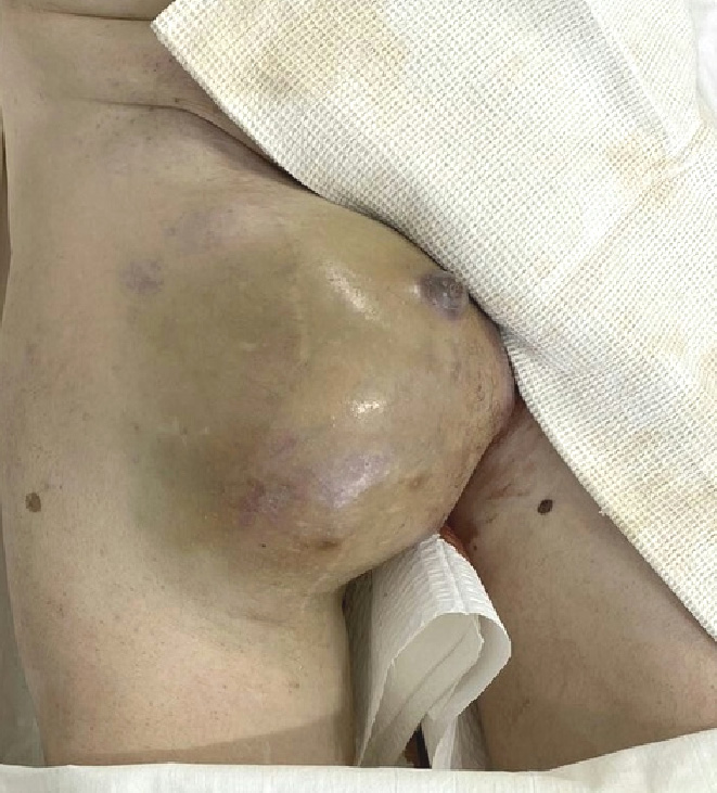 Локальный статус: на обеих ногах – выраженное варикозное расширение подкожных вен. Симптом Гаккенбруха положителен с обеих сторон. Пигментация кожи голени слева. Пульсация артерий нижних конечностей: на общей бедренной артерии с обеих сторон, дистальнее не определяется. Справа в паховой области имеется больших размеров (25×25 см) пульсирующее образование – аневризма с истонченным участком кожи по ее медиальной поверхности, прикрытым сгустком крови. Образование при пальпации умеренно болезненно. Повязка, наложенная бригадой СМП, незначительно промокла геморрагическим отделяемым.