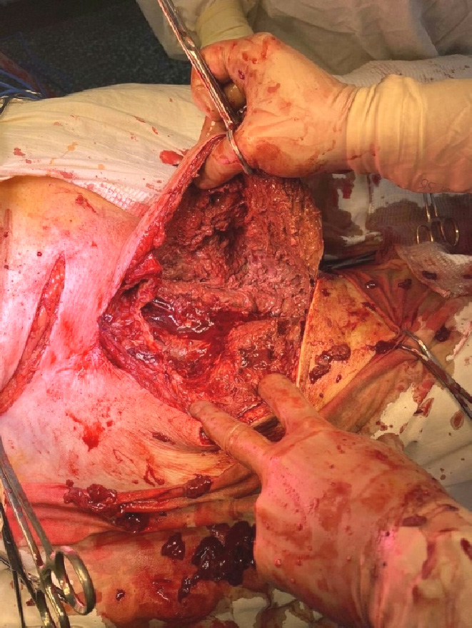 Под эндотрахеальным наркозом межмышечным доступом в подвздошной области справа была выделена наружная подвздошная артерия. Проекционным доступом в паховой области справа частично выделена аневризма. Размер аневризмы после выделения – 20×25 см. При вскрытии полости удалено до 1 л старых тромбов, сгустков и крови (рис. 3). Взят посев на микрофлору (результат от 09.01.2020 – рост микрофлоры не выявлен). Последовавшее после очищения полости кровотечение из общей бедренной артерии остановлено прошиванием нитью Prolene 0. Достигнут гемостаз. Возник значительный избыток тканей после удаления сгустков. Иссечен кожно-жировой лоскут вместе со стенкой аневризмы примерно 15×15 см. Послойное ушивание раны, дренирование резиновыми выпускниками.
