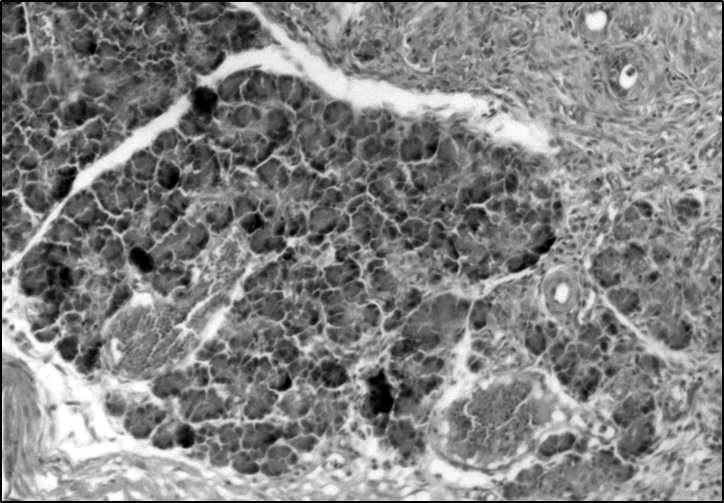 Рис. 2. Поджелудочная железа, жизнеспособный панкреатический островок, 7-е сутки, экспериментальная группа с соединением «L-17». Окр. гематоксилином и эозином, ув. ×200
