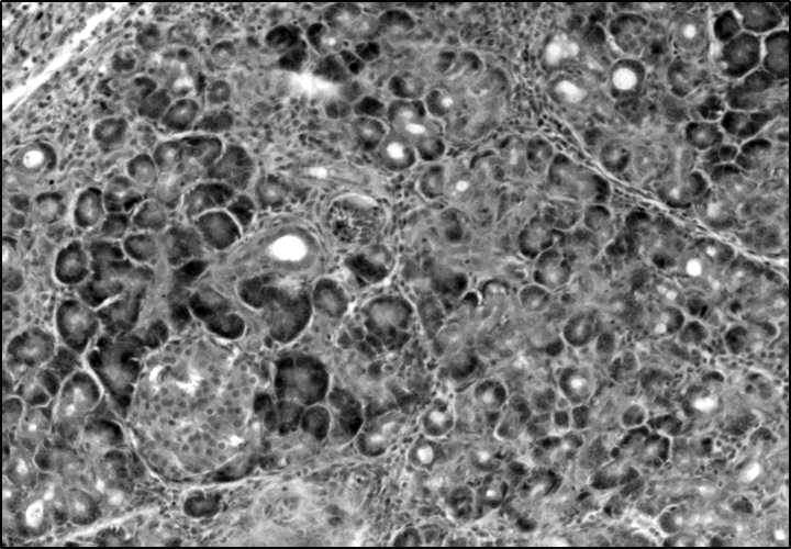 К 7-м суткам течения ОПП в контрольной группе в поджелудочной железе были расширены соединительнотканные междольковые трабекулы с признаками выраженного отека и интенсивной лейкоцитарной инфильтрацией. Ацинарные структуры экзокринной части долек железы в большинстве случаев визуализировались с признаками деструкции, сохранилась лишь малая часть экзокриноцитов (менее 30 %). Строма долек железы была инфильтрирована сегментоядерными лейкоцитами. Сохранившиеся панкреатические островки Лангерганса обнаруживались с признаками выраженного отека стромы, большинство клеток островков (более 50 %) было деструктивно изменено (рис. 1). В парапанкреатической клетчатке и висцеральной брюшине имелась интенсивная инфильтрация полиморфноядерными лейкоцитами, что свидетельствовало о развитии гнойного перитонита и гнойного парапанкреатита – флегмоны парапанкреатической клетчатки в брыжейке двенадцатиперстной кишки. Выявленные изменения соответствовали гистоморфологическим проявлениям второй фазы течения острого панкреатита с развитием гнойно-септических осложнений в виде гнойного перитонита и некротического парапанкреатита. В легких определялись сливные фокусы бронхопневмонии с поражением средних и мелких бронхов, в большинстве случаев обнаруживалось их слияние (фокусов) с развитием долевой пневмонии. В перибронхиальных сосудах в просвете отмечалось краевое стояние лейкоцитов и признаки лейкодиапедеза. В двух случаях (20 %) макроскопически выявлено осложнение пневмонии в виде эмпиемы плевры. В селезенке визуально обнаружено снижение числа лимфоидных фолликулов белой пульпы и оголение стромы органа, границы между красной и белой пульпой были стерты. В сохранившихся лимфоидных фолликулах была нарушена клеточная зональность. Данные изменения свидетельствовали о выраженной воспалительной реакции в паренхиме селезенки. В печени балочное строение органа было не изменено, но сохранялись признаки полнокровия сосудов венозного коллектора очагового характера, а в части портальных трактов перифокально обнаруживали мелкие круглоклеточные инфильтраты. В паренхиме органа определялись очаговые некрозы гепатоцитов в виде кариолизиса ядер и разрушенных клеточных мембран с круглоклеточной инфильтрацией. В части случаев (70 %) в портальных трактах обнаруживалась выраженная пролиферация протокового эпителия, множественные перипортальные некрозы и жировая дистрофия гепатоцитов, что указывало на вовлечение печени в системную воспалительную реакцию. В почках находили полнокровие сосудов, а в синусоидальных сосудах коркового вещества отмечали капилляростаз с очаговыми скоплениями лейкоцитов, что указывает на развитие острого нефрита. В сердце в миокарде желудочков выявляли признаки выраженного интерстициального отека, подэпикардиальные сосуды были полнокровны с явлениями капилляростаза. В миокарде предсердий – определялись подэпикардиальные фокусы деструкции кардиомиоцитов в виде кариопикноза ядер и распада саркоплазмы, круглоклеточная инфильтрация в зоне дистрофии кардиомиоцитов. Это позволяло говорить о наличии начальных признаков развития миокардита и перикардита, что подтверждало вовлечение сердца в системную воспалительную реакцию.