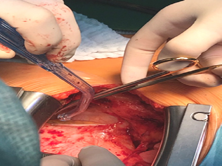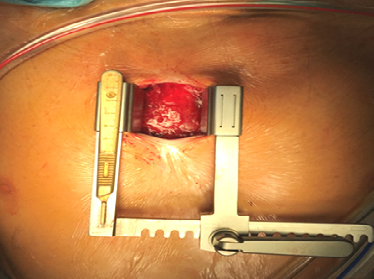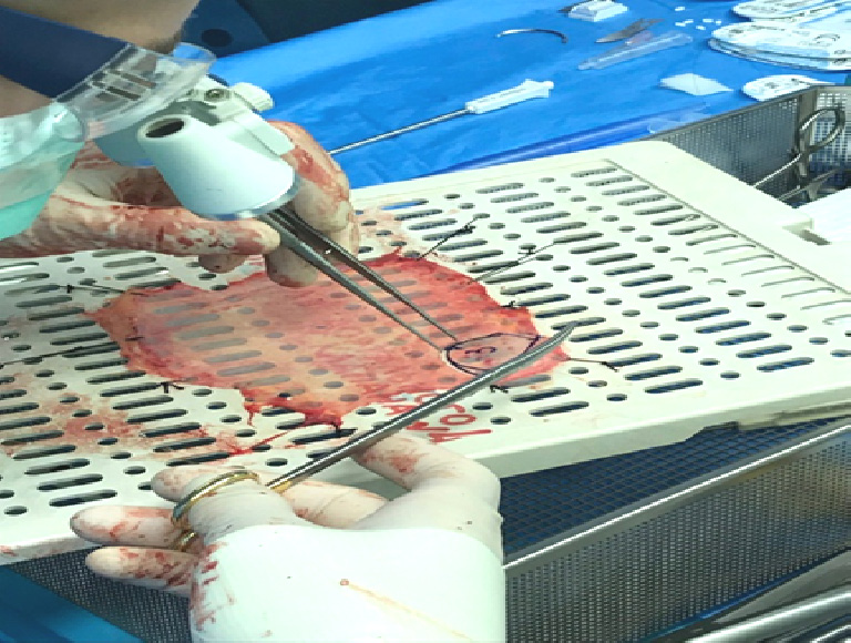 Хирургическая тактика была следующей. Пациент помещался в положение лежа на спине или на подушке под лопатками, чтобы облегчить воздействие на корень аорты и клапаны. Больной интубирован с использованием однопоточной эндотрахеальной трубки. Был осуществлен через кожный разрез длиной 7–10 см от яремной вырезки (рис. 1) через верхнюю мини-Т-стеротомию в 3-м или 4-м межреберье. Доступ к сердцу – продольная срединная стернотомия или мини-T- или мини-J-стернотомия. Выбор доступа зависел от тяжести состоянии пациента, обусловленного, например, большим обьемом левого желудочка, выраженным кальцинозом аортального клапана по данным КТ аорты или ЭхоКГ. Интраоперационная ЧПЭхоКГ выполнялась для оценки пораженного аортального клапана перед стернотомией. Продольная срединная стернотомия или мини-J-T-стернотомия создают идеальные условия для манипуляции на всех отделах сердца. После Т-стернотомии проводился забор аутоперикарда (рис. 2).