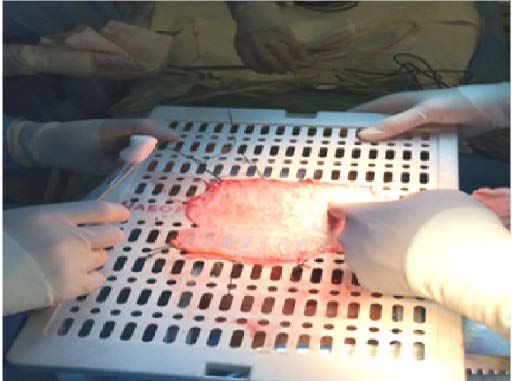 Далее фиксировали перикард в специальном приборе, предложенном автором операции, с помощью ножниц и влажных тупферов очищали шероховатую часть перикарда с целью профилактики эмболических осложнений (рис. 3).
