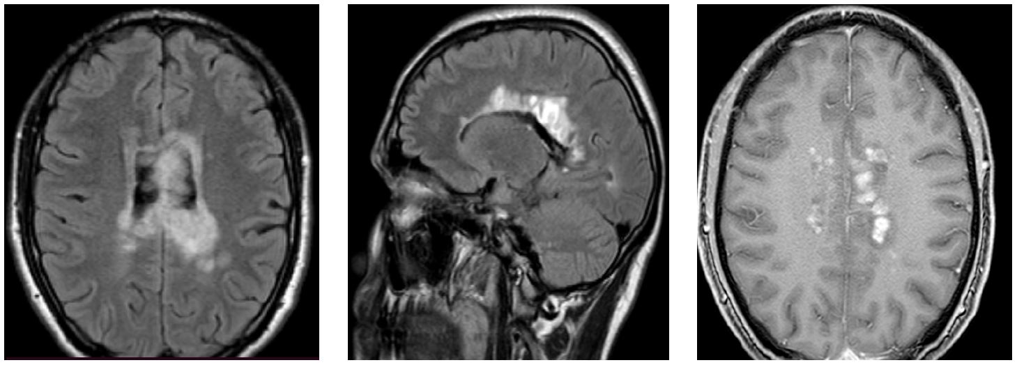 – 03.06.2020: некоторая положительная МРТ-динамика, очаги 3–32 мм, с умеренным перифокальным отеком, уменьшением кистовидной деформации очагов, регресс активных очагов до 7 в лобных, теменных, височных долях, мозолистом теле. Повышение сигнала от хиазмы с признаками увеличения ее объема.