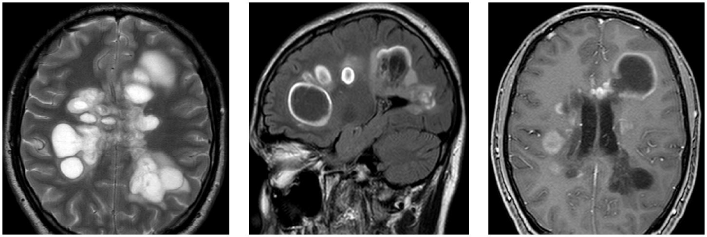 – 20.05.2020: головной мозг – ОРЭМ? Резко отрицательная динамика по количеству очагов, срединные структуры смещены вправо на 2 мм, от 3 до 40 мм, с умеренным перифокальным отеком, с кистозной трансформацией крупных, повышение сигнала от хиазмы с увеличением ее объема. Компримированы боковые желудочки с перивентрикулярным отеком. После контраста – выраженное неоднородное усиление сигнала по периферии от большинства выявленных очагов;