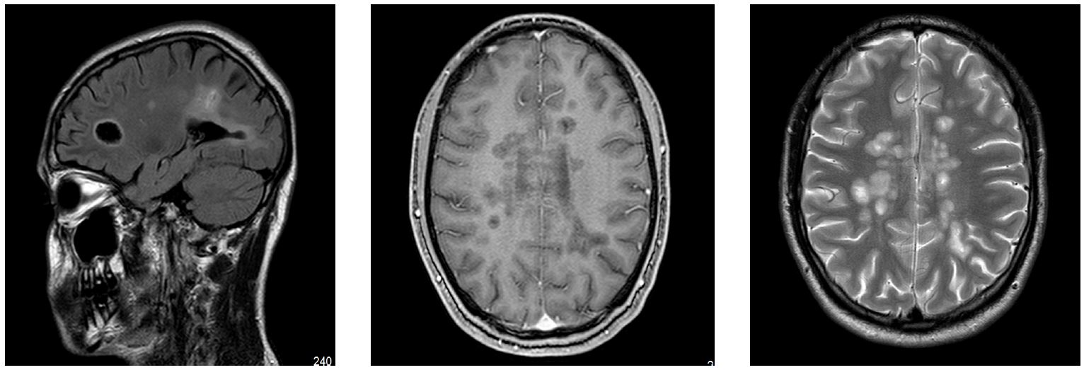 Сын пациента – Ш., 21 год – с августа 2019 г. при физических нагрузках, при ходьбе, в тепле – непостоянное снижение зрения сначала на левый, затем на правый глаз. Был осмотрен в Центре РС в январе 2020 г., диагноз: G37.9, вероятный рассеянный склероз, дебют. Состояние постепенно ухудшилось – наросли зрительные нарушения, появилась шаткость и чувствительные расстройства. Выполнено МРТ с контрастом 26.01.2020 (рис. 1): обострение, отек вокруг очагов, грубая активность процесса во все очагах, массивное накопление контраста, появление очагов в шейном отделе спинного мозга на уровне С2, также повышение сигнала и активность и области хиазмы справа, структурные изменения хиазмы слева.