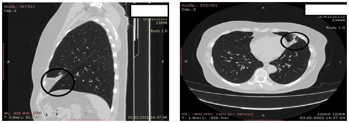 Рис. 1. Пациентка Б. Компьютерная томография ОГК от 03.02.2022: на представленных компьютерных томограммах в боковом и поперечном срезах видно, что латеральные отделы S5-сегмента левого легкого уменьшены в объеме, безвоздушны, бронхи деформированы, мелкие бронхоэктазы