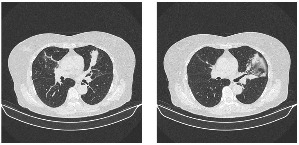 Рис. 3. Пациентка Б. Компьютерная томография ОГК от 22 сентября 2022 г.: рассасывание ателектаза в S4 – 5 слева и в средней доле справа, бронхоэктазы в S4 – 5 слева