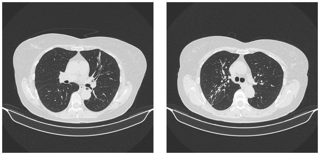 Рис. 2. Пациентка Б. Компьютерная томография ОГК от 15 июня 2022 г.: картина двухстороннего бронхиолита, ателектаза S5 правого легкого и субсегментарного ателектаза S4 левого легкого. Немногочисленные солидные очаги обоих легких, возможно, эозинофильные инфильтраты. Единичный увеличенный правый трахеобронхиальный узел. При сравнении с МСКТ от 03.02.2022 – появление ателектазов, бронхиолита и увеличение единичного лимфоузла