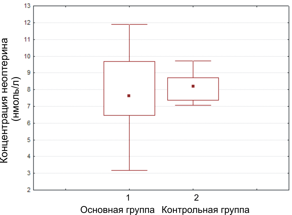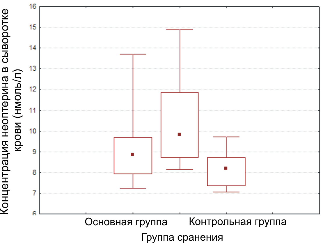 Концентрацию неоптерина определяли методом твердофазного иммуноферментного анализа (ИФА) с помощью тест-системы Neopterin ELISA (кат. No. 59321; лот ENO230) (IBL, Германия), чувствительность которой по данным производителя составляла не менее 0,7 нмоль/л. Оптическую плотность проб измеряли на вертикальном фотометре StatFax 3200 (Awareness, США). Правильность полученных данных контролировали по результатам измерения двух контрольных образцов, входивших в состав тест-систем. Содержание неоптерина в первом контрольном образце составило 5,48 нмоль/л при допустимом диапазоне результатов 3,5–8,1 нмоль/л, а во втором – 23,34 нмоль/л при допустимом диапазоне 13,6–28,2 нмоль/л.