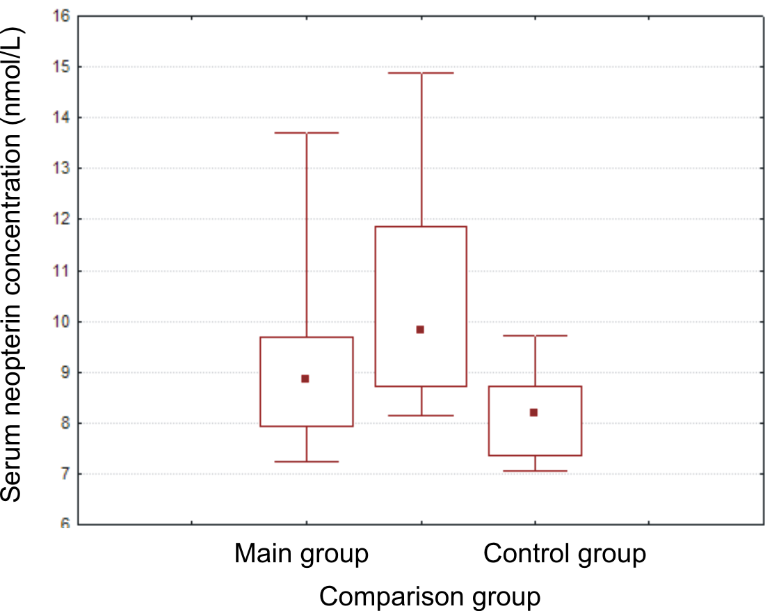 Results. Statistically significant differences in the level of serum neopterin concentration (p = 0.0016) were revealed between the studied groups. The highest concentration of neopterin was noted in the comparison group, where it was 10.31 ± 2.02 nmol/l, exceeding the results of the control group (p=0.02256) and the main group (p=0.04996). Three months after surgical treatment of patients in the main group, the median content of serum neopterin decreased by 1.161 times (p = 0.049029).
