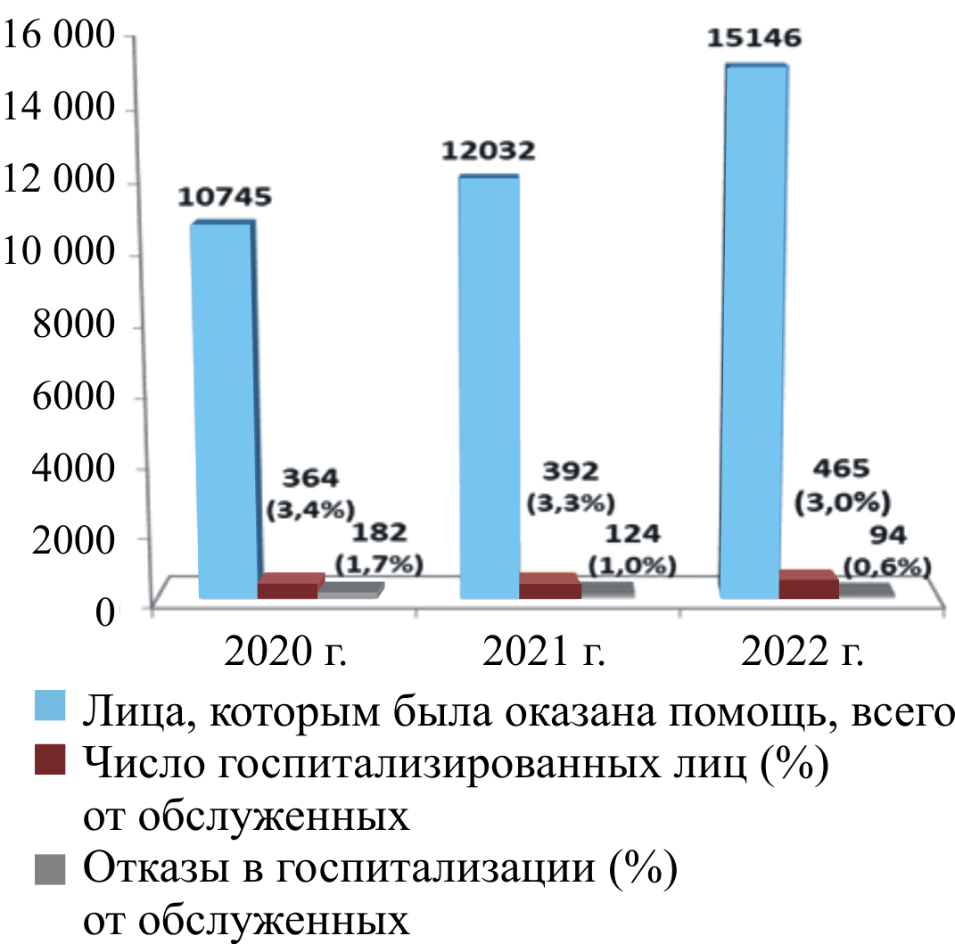 The data we obtained demonstrate positive trends towards a decrease in refusals from hospitalization (1.7; 1.0; 0.6 %, respectively, over the years). In 2022, their number decreased by 2.8 times compared to 2020, amounting to 94 cases versus 182. There were no cases of untimely hospitalization that led to a deterioration in the patient’s condition. During the researched period, one case of discrepancy in diagnosis upon admission to the hospital was recorded, which did not lead to the development of severe complications or death of the patient.