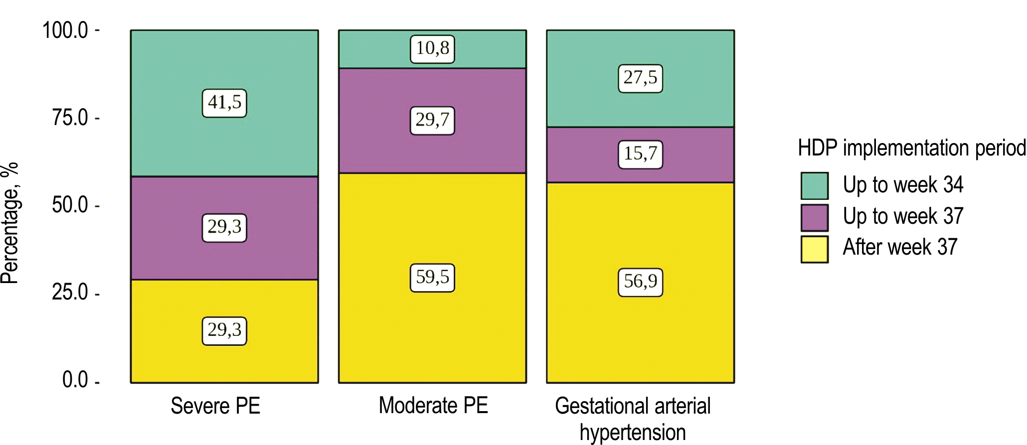 The International Society for the Study of Hypertension in Pregnancy classification divides preeclampsia into premature, birth before week 37; full-term, delivery after week 37; and postpartum preeclampsia. Among modern classifications, preeclampsia was characterized as early onset (delivery at a term less than 34 weeks) and late onset (delivery at a term more than 37 weeks). However, how such a classification is applicable in clinical practice and, at the same time, a classification reflecting the timing of HDP manifestation is extremely useful for development of laboratory diagnostic tests, taking into account the different pathogenesis of early and late forms of preeclampsia, remains debatable [17; 18].