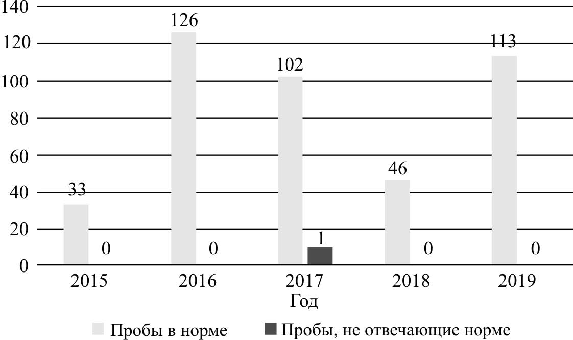 В предыдущие и последующие годы также проводились исследования проб пищевых продуктов: в 2015 г. исследовано 13,5 % (n = 193) от числа всех проб пищевых продуктов. Неудовлетворительными оказались 2,1 % (n = 4). В анализируемом году доля проб плодоовощной продукции составила 80,3 % (n = 155), рыбы и рыбопродуктов – 17,1 % (n = 33), мяса и мясопродуктов – 2,6 % (n = 5).