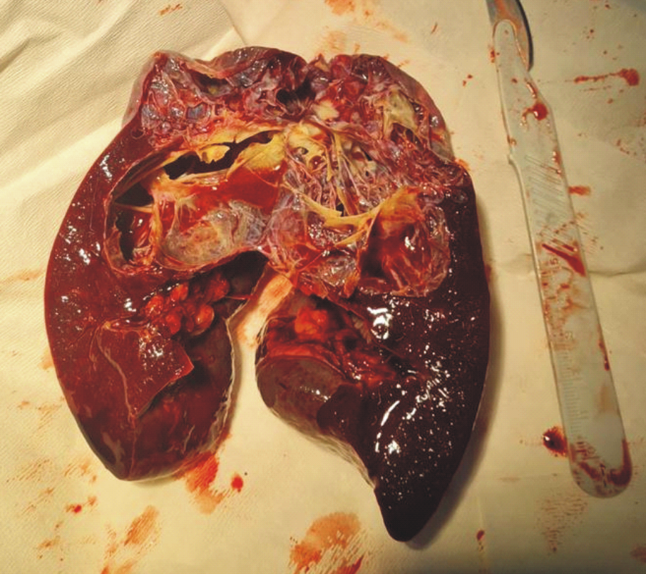 Рис. 1. Макропрепарат: левая доля печени с кистозной трансформацией протоков, фиброз паренхимы
