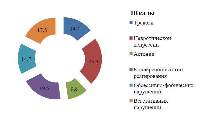 Приведенные данные подтверждаются и вычислениями удельного веса симптомов каждого из шести вариантов шкал опросника (рис. 1). Депрессивные проявления определяются у работников чаще остальных (23,3 %), вторыми по распространенности являются диссоциативные нарушения – конверсионный тип реагирования (19,6 %), у 17,8 % работников обнаруживаются вегетативные нарушения. Таким образом, в группе работников, подвергающихся воздействию химического фактора производства в сочетании с факторами угрозы жизни (взрыво- и пожароопасностью), определяется тенденция формирования преморбидных или пограничных расстройств психического здоровья, которые могут быть очерчены кругом симптомов, укладывающихся в диагностические критерии неврастении (МКБ-10 – код F48.0) [12] и других расстройств настроения (МКБ-10 – F38.0–F38.1) [12].