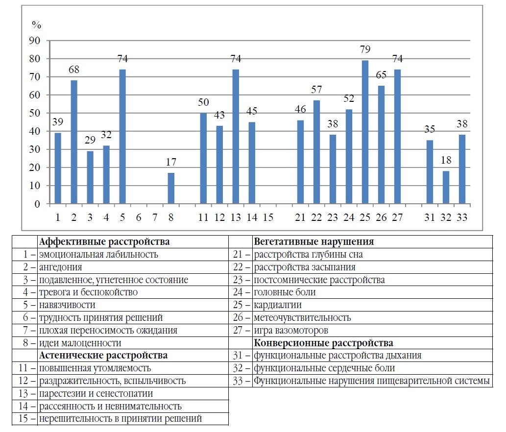 Симптомы, характеризующие проявления психической дезадаптации (фактически предболезненные психические проявления) у работников основной группы, достоверно отличающиеся от группы контроля (p < 0,05), представлены преимущественно группой из восьми аффективных симптомов, пяти симптомов, которые могут быть отнесены к астеническим проявлениям, семи состояний, характеризующих вегетативные нарушения и трех проявлений конверсионного типа реагирования. Удельный вес жалоб и ощущений, полученных в ходе обследования среди работников основной группы, представлен на рис. 2.