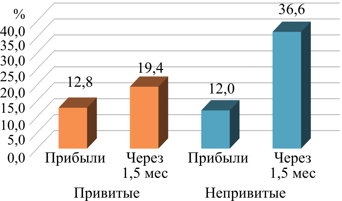 A comparative assessment of the hidden component of the epidemic process of pneumococcal disease in dynamics among vaccinated and unvaccinated military personnel revealed significant differences. Among unvaccinated military personnel, after 1.5 months, the number of S. pneumoniae carriers increased 3 times (from 17 to 52; c2McNemar = 26.064; p < 0.0001), and amounted to 36.6 % (Fig. 1). In vaccinated military personnel, the number of carriers increased only 1.5 times (from 29 to 44; c2McNemar = 3.947; p = 0.047), amounting to 19.4 %, which indicates the proactive effect of immunization on the risk of military personnel infection with S. pneumoniae.