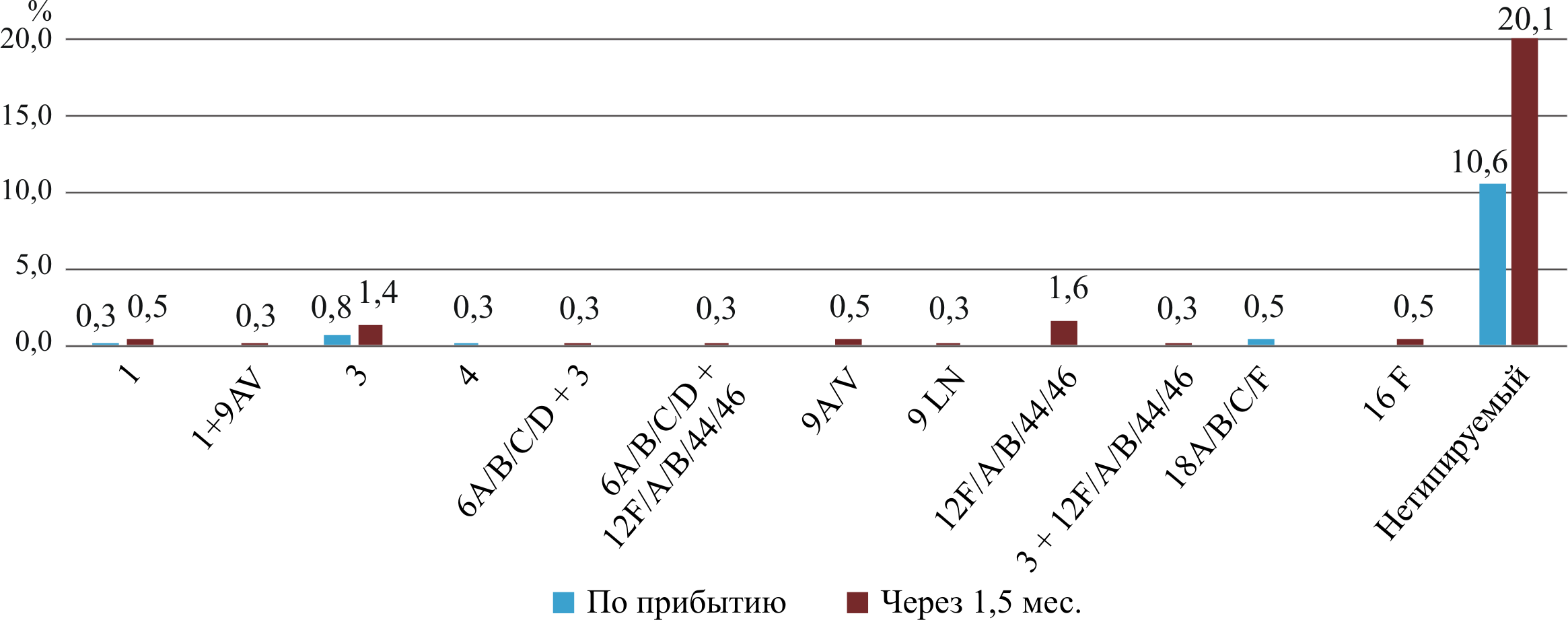Materials and methods. The study was conducted among 369 military personnel of the military unit of the Sverdlovsk region. Determination of the frequency and serotype of S. pneumoniae was carried out upon admission and after 1.5 months of stay in the military collective using the multiplex PCR method.