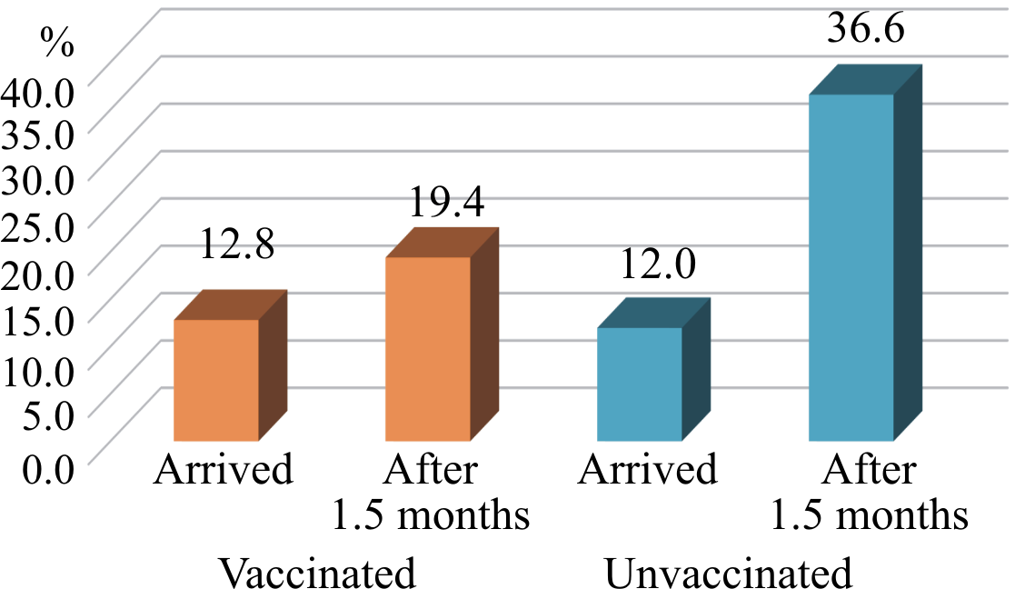 Fig.1. Carriage frequency of S. pneumoniae in vaccinated and unvaccinated military personnel, %