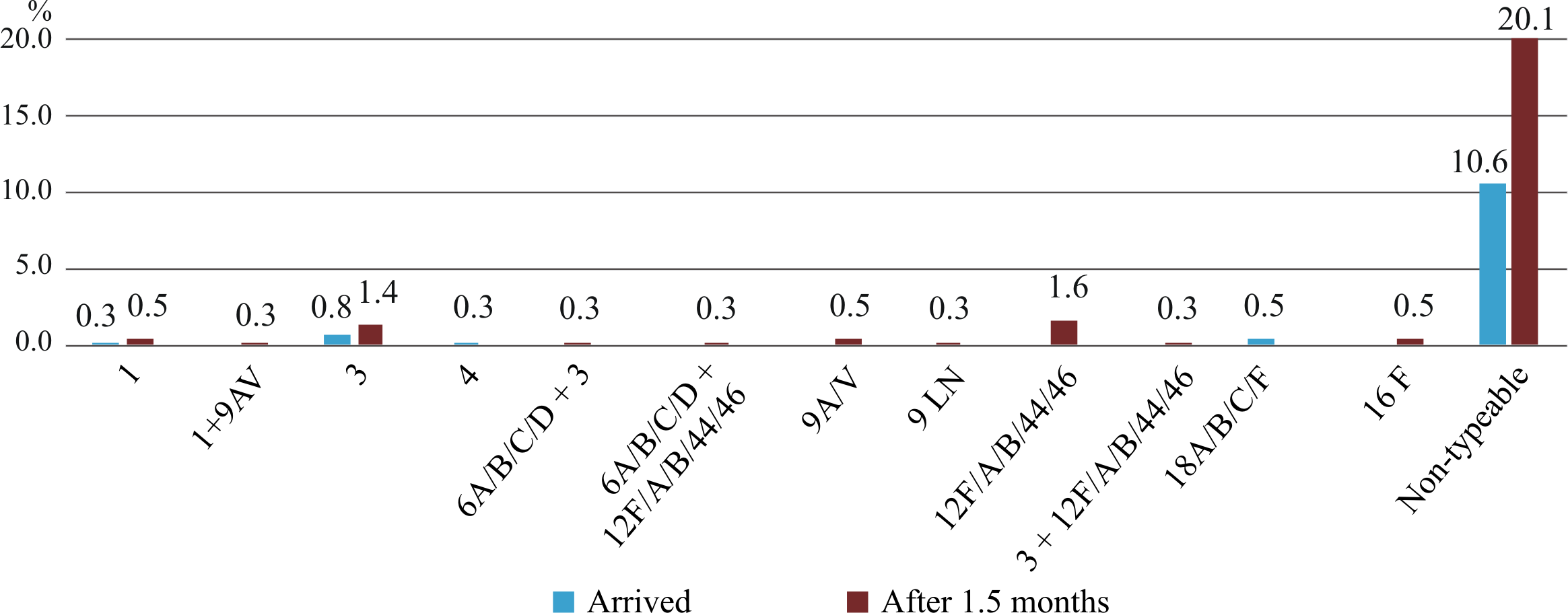 Upon arrival at the military unit, the serotype landscape of pneumococci was represented by four vaccine isolates 1, 3, 4, 18A/B/C/F (1.9 %) and non-typeable serotypes (10.6 %).