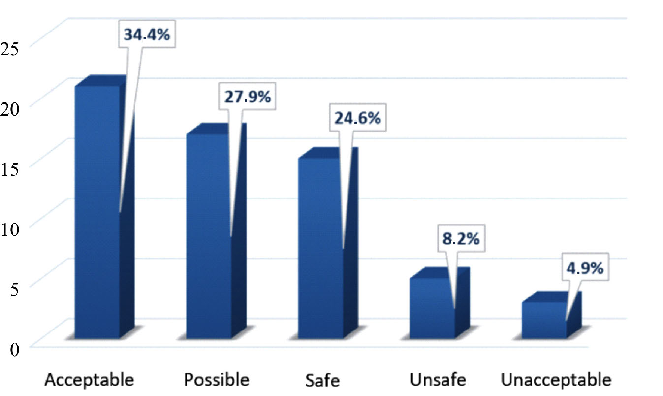 In general, the attitudes towards immunomodulatory therapy are shown in the figure: 21 people (34.4 %) find it acceptable to use, 17 respondents (27.9 %) consider it possible, 15 people (24.6 %) think it is safe to use, 5 people (8.2 %) see it as unsafe, and 3 people find it completely unacceptable (4.9 %).