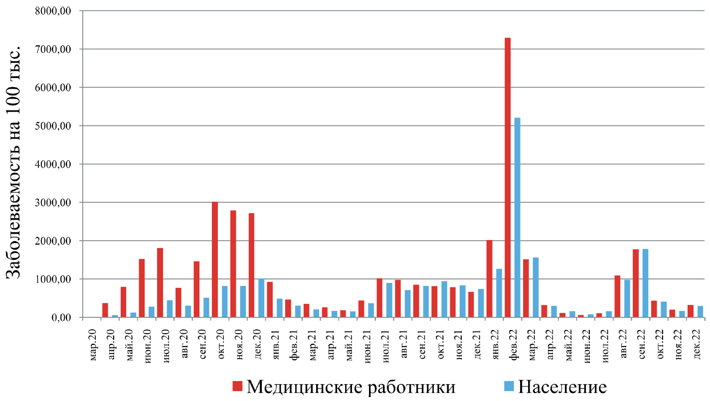 За период пандемии была накоплена достаточно убедительная доказательная база, касающаяся профилактики инфицирования вирусом SARS-CoV-2 медицинских работников. Как отмечают авторы, последствия COVID-19 оказывают негативный эффект не только на здоровье и благополучие медицинских работников, но и на саму систему здравоохранения [7; 8]. На сегодняшний день опубликовано много отечественных и зарубежных работ по характеристике заболеваемости как населения в целом, так и медицинских работников в частности [9; 10]. Между тем в отечественной литературе мы не встретили работ по сравнительной оценке проявлений эпидемического процесса новой коронавирусной инфекции среди населения в целом и медицинских работников как основной группы риска инфицирования вирусом SARS-CoV-2 в период пандемии.