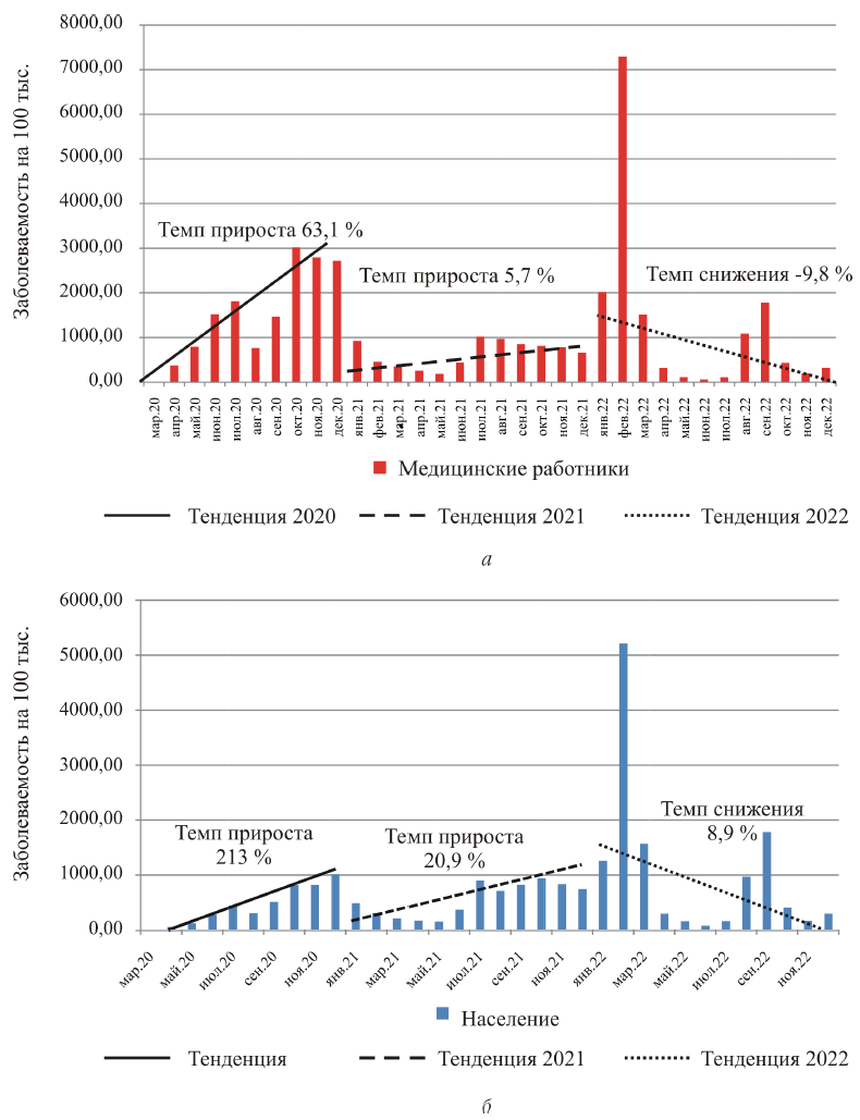 Рис. 2. Тенденции заболеваемости медицинских работников (а) и совокупного населения (б) в различные периоды развития пандемии