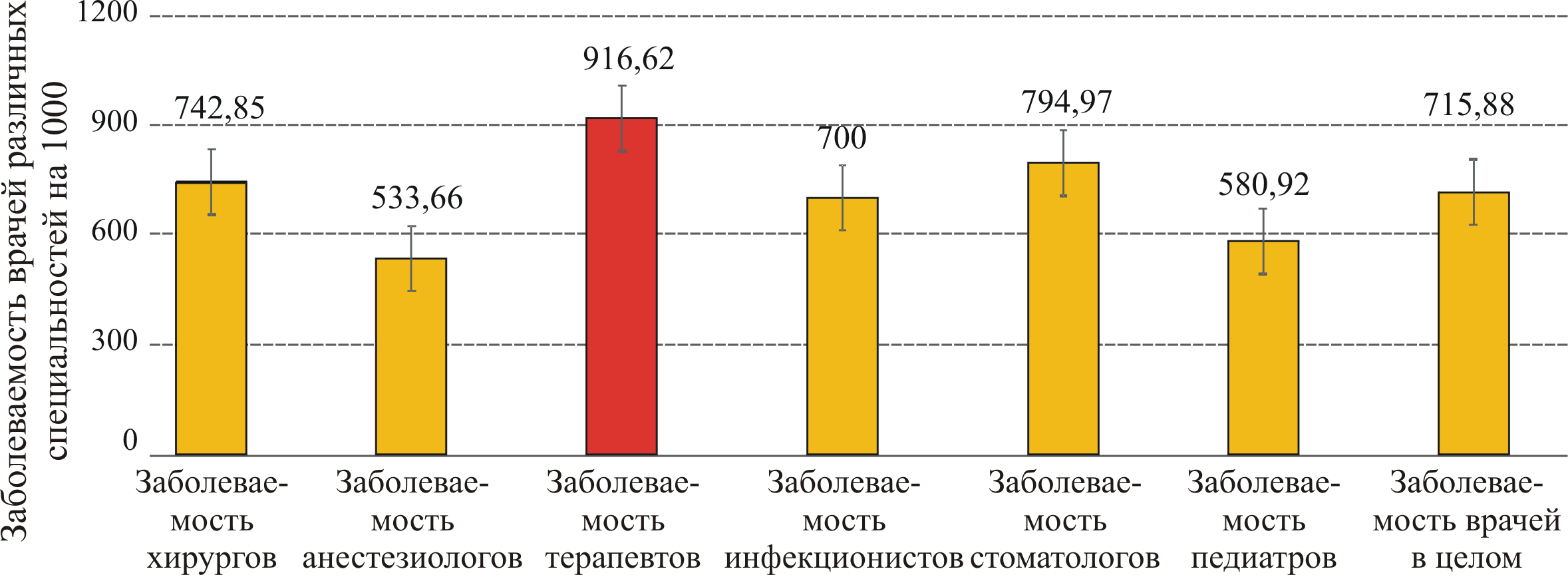 Оценка заболеваемости врачей различных специальностей выявила, что при отсутствии различий в показателях заболеваемости хирургов, анестезиологов, инфекционистов и педиатров, заболеваемость терапевтов достоверно превышала таковую среди врачей в целом (рис. 3). Показатель заболеваемости врачей терапевтического профиля составил 916,62 ± 11,86, превысив заболеваемость врачей в целом на 28,04 % (t = 24,06; p = 0,001). Высокий уровень заболеваемости (второе рейтинговое место) отмечался и у врачей-стоматологов – 794,97 ± 35,86 что обусловлено особенностями их профессиональной деятельности (непосредственная близость к выходным воротам возбудителя инфекции, использование специализированного стоматологического оборудования, способного генерировать аэрозоль) [21; 22].